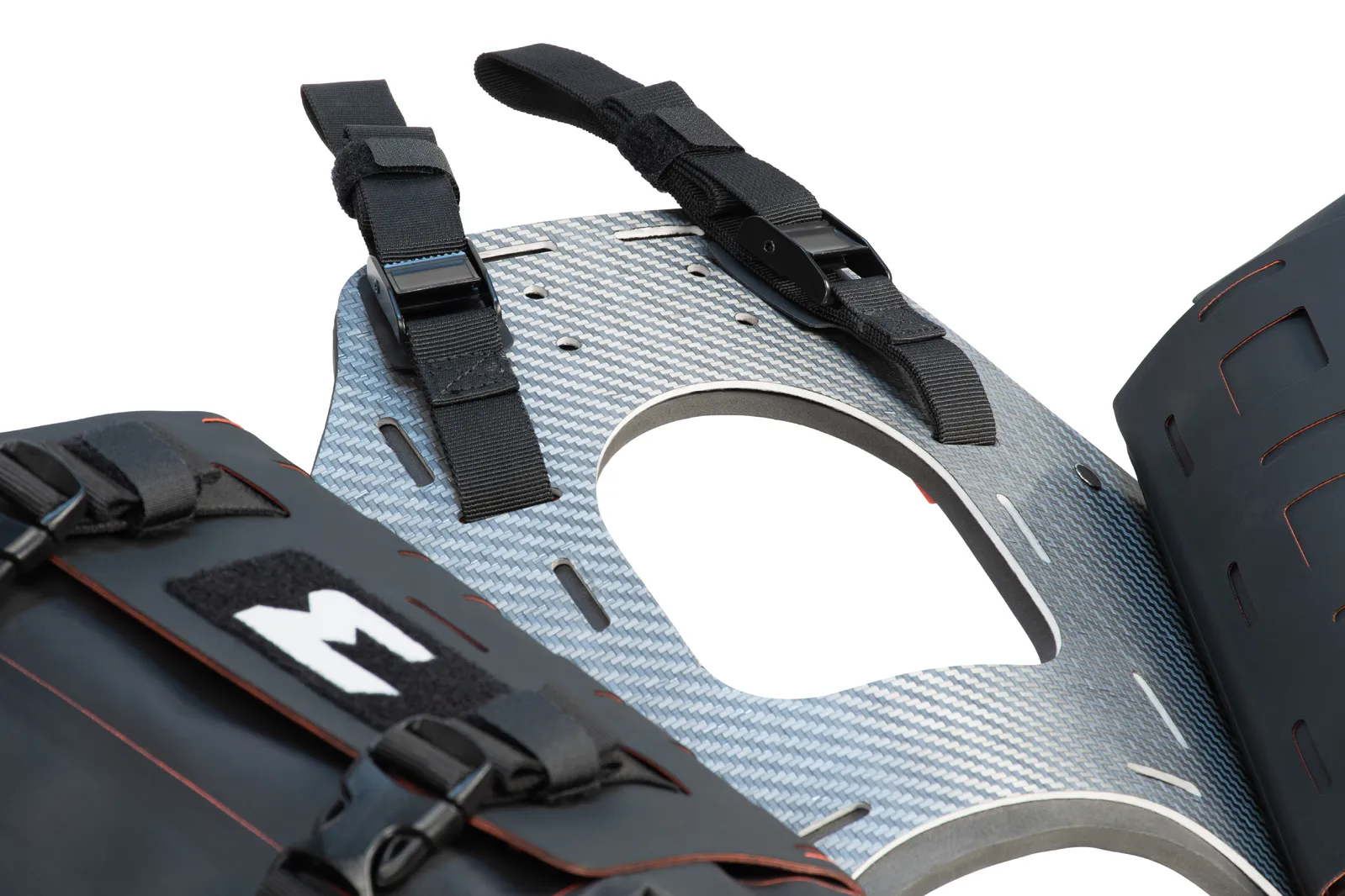 At the heart of the system is the Structural Center Piece, which sits on the rear of the motorcycle between the two bags. This rigid structural element distributes the load evenly, stabilises the entire system and allows the width of the Hailstorm 35 to be adjusted. Thanks to this adjustable design, the system can be adapted to different seat widths and rear layouts, ensuring compatibility with a wide range of motorcycles. The Structural Center Piece can also be used in combination with the Anchor Point for Hailstorm for rear mounting without straps (anchor point not included)