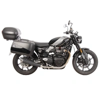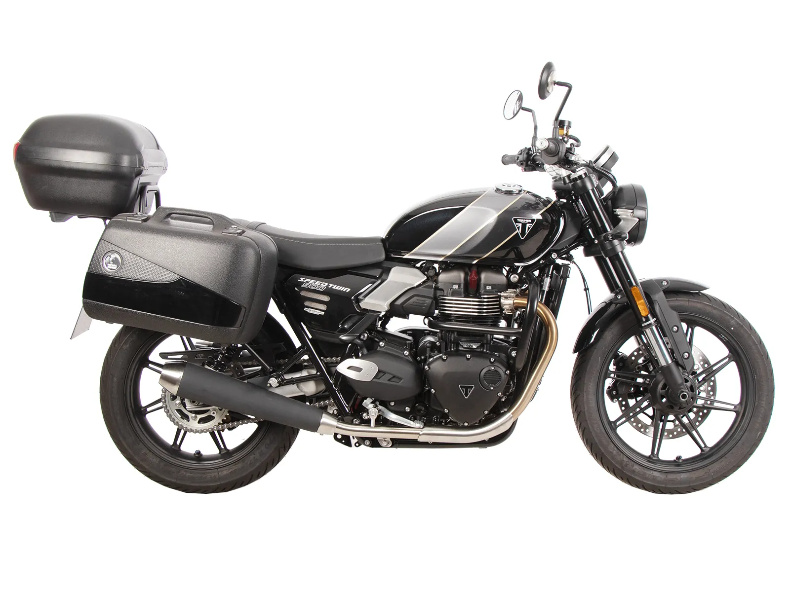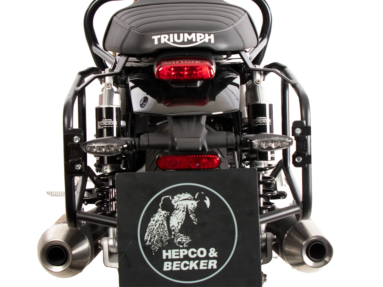 HEPCO&BECKERs standard side carriers are firmly bolted to the motorcycle. All normal hard lugagge cases from Hepco & Becker fit this carrier. The cases are fastened to the carrier by means of a quick release fastener. For this purpose, an aluminum adapter is required which is normally included within the delivery of the case. (Item number: 700114) This aluminum adapter is screwed to the rear right and left of the carrier and offer the holder for the luggage lock.
