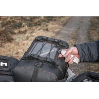 On the outside, the Sidekick 20 features a transparent outer zipper pocket, making it easy to see what is stored inside at a glance. Above it, a separate drawstring system allows small items such as glovesor similar gear to be secured quickly and kept within easy reach. A side-mounted carrying handle makes the bag easy to handle on and off the bike.
