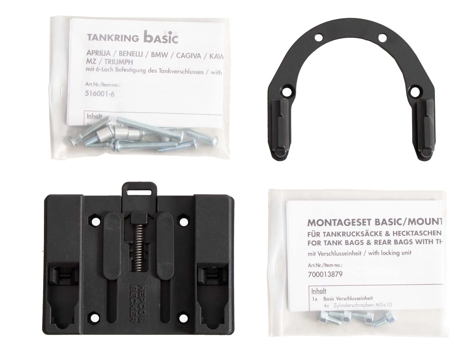 The scope of delivery includes a BASIC tank ring, as well as the fastener for tankbags, which can be individually screwed to the tank bag, depending on the shape of the tank and the angle of the handlebars.
