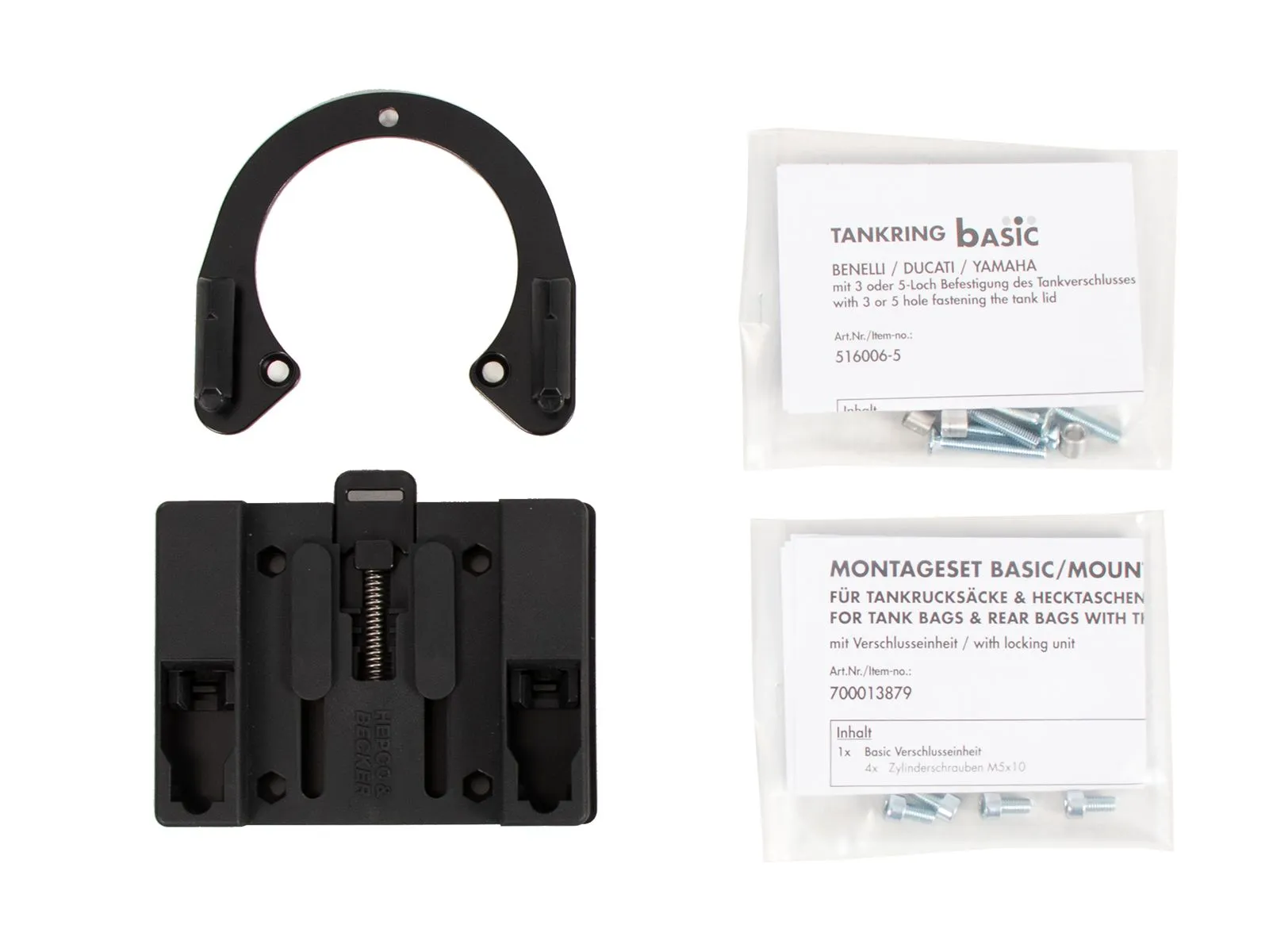 The scope of delivery includes a BASIC tank ring, as well as the fastener for tankbags, which can be individually screwed to the tank bag, depending on the shape of the tank and the angle of the handlebars.