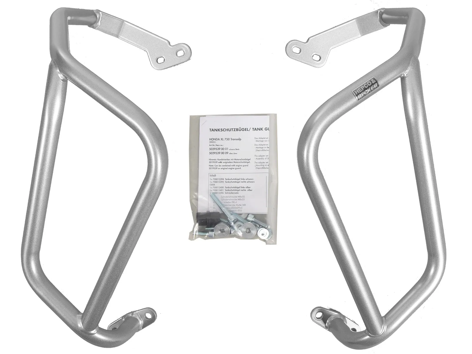 | Model-specific information: | Can be combined with engine guard 5019539/5019556 or original engine guard. The adapter set 42139539/42139556 is required for: Mounting of 5029539/5029556 with/or 5019539/5019556., The adapter set 42139539/42139556 is not required for: Mounting on an already installed engine guard (Hepco&Becker or original)., Installation of H&B engine gurad: 1x 42139539/42139556 (adapter), installation of H&B tank guard: 1x 42139539/42139556 (adapter), H&B engine and tank guard: 1x 42139539/42139556 (adapter), Honda protection bar and H&B protection bar: no adapter required. |
